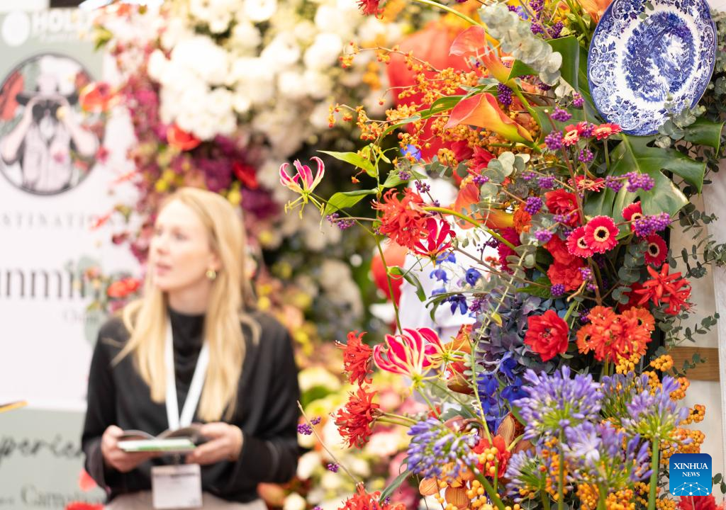 An exhibitor is seen at the 2025 International Floriculture Trade Fair (IFTF) in Vijfhuizen, the Netherlands, Nov. 4, 2025. The IFTF is an annual event in the Netherlands that brings together horticultural professionals, flower lovers and industry experts from around the world. Held from Nov. 4 to 6, this year's IFTF has attracted about 290 exhibitors from more than 30 countries and regions. (Photo by Sylvia Lederer/Xinhua)