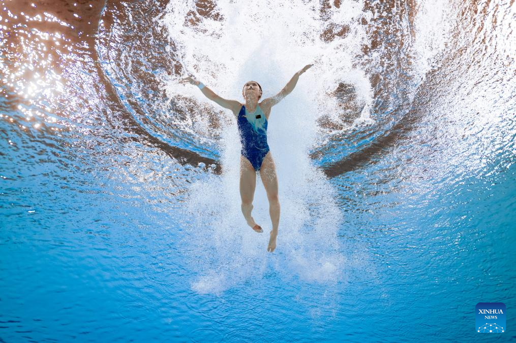 Wang Weiying of Guangdong team reacts after a 10m-platform dive during the women's individual combined final of the diving competition at China's 15th National Games in Guangzhou, south China's Guangdong Province, Nov. 4, 2025. (Xinhua/Xia Yifang)
