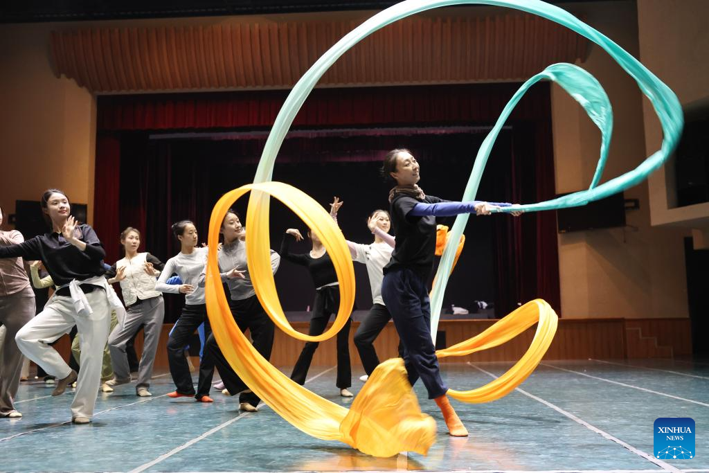Dancers rehearse the dance drama "Flower Rains Along Silk Road" in Lanzhou, northwest China's Gansu Province, Nov. 3, 2025.