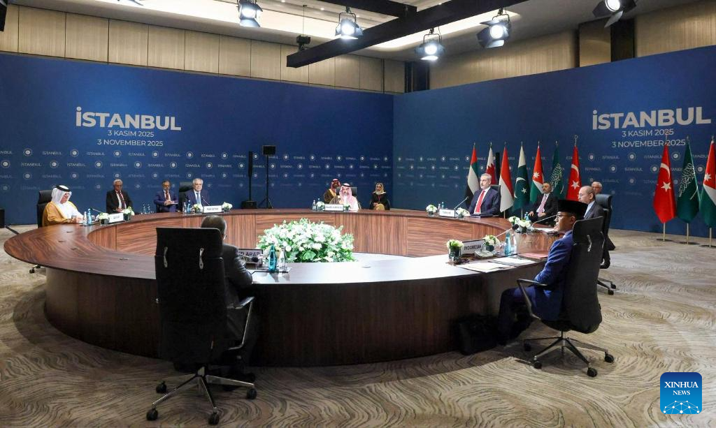 Foreign ministers from seven countries including Türkiye, the United Arab Emirates, Indonesia, Qatar, Pakistan, Saudi Arabia and Jordan met in Istanbul on Monday to discuss efforts to uphold the Gaza ceasefire and plan for the enclave's future, as Israeli strikes continued despite the truce. (Ministry of Foreign Affairs of Türkiye/Handout via Xinhua)