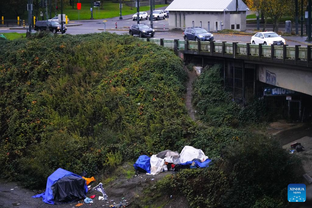 Homeless persons are seen camping near a bridge in Portland, Oregon, Nov. 5, 2025. On Wednesday, the U.S. federal government shutdown entered its 36th day, surpassing the previous 35-day record set during the 2018-2019 shutdown, making it the longest government shutdown in U.S. history. (Xinhua/Wu Xiaoling)