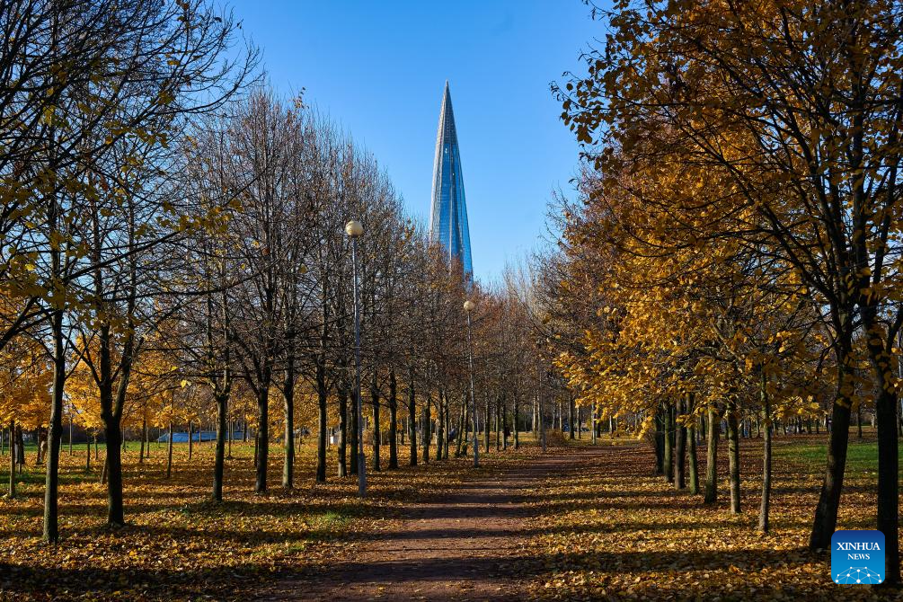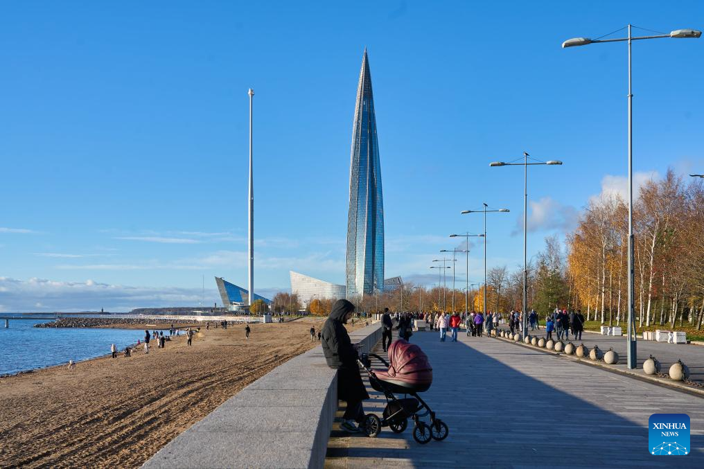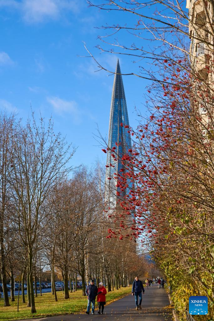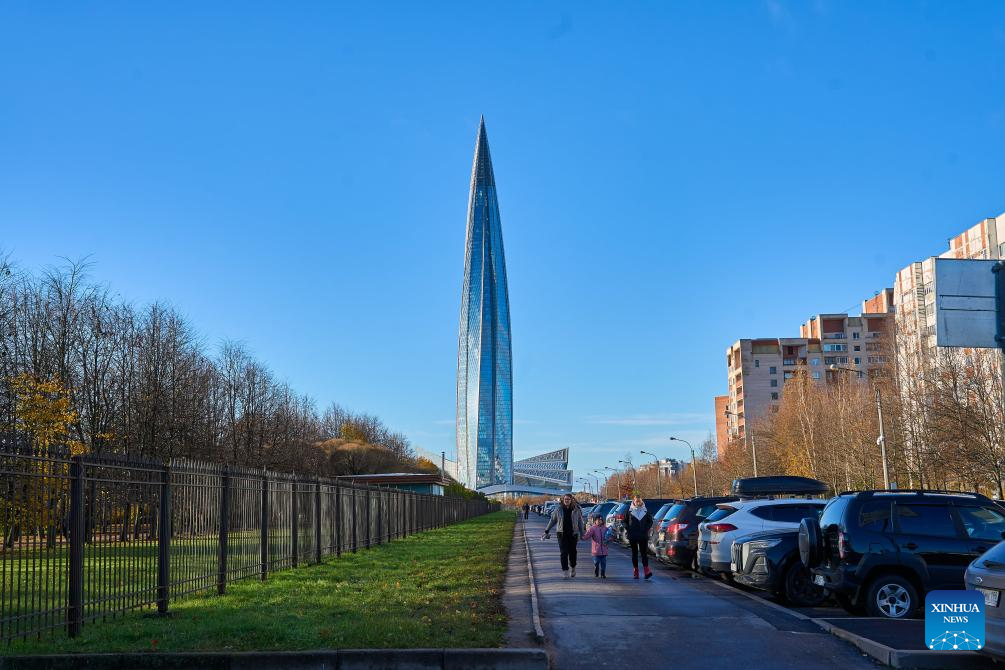 This photo taken on Nov. 4, 2025 shows the Lakhta Center in St. Petersburg, Russia. The Lakhta Center is located in St. Petersburg, Russia. With a height of 462 meters, it ranks as the tallest building in Russia. (Photo by Guo Feizhou/Xinhua)