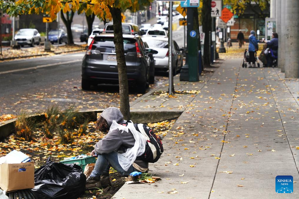 A homeless person is seen sitting on the sidewalk in Portland, Oregon, the United States, Nov. 4, 2025. The U.S. Senate on Tuesday again failed to pass a temporary funding bill, marking the 14th unsuccessful attempt. This means the federal government shutdown is on track to surpass the 35-day record set during the 2018-2019 shutdown and become the longest in U.S. history. (Xinhua/Wu Xiaoling)