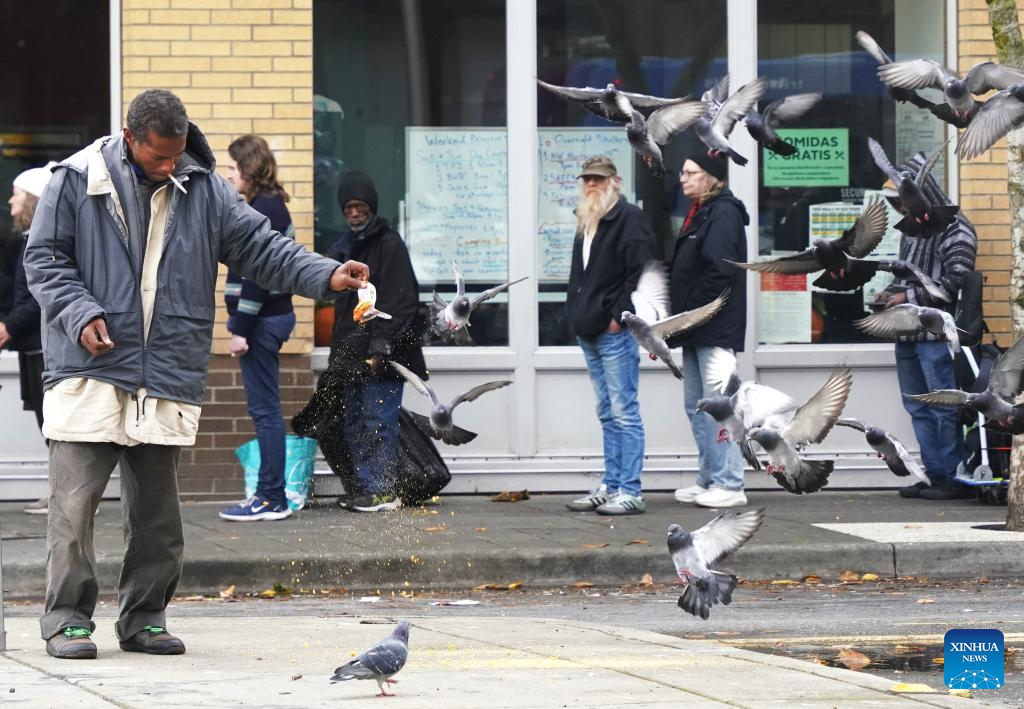 A homeless person is seen feeding pigeons on the street in Portland, Oregon, the United States, Nov. 4, 2025. The U.S. Senate on Tuesday again failed to pass a temporary funding bill, marking the 14th unsuccessful attempt. This means the federal government shutdown is on track to surpass the 35-day record set during the 2018-2019 shutdown and become the longest in U.S. history. (Xinhua/Wu Xiaoling)