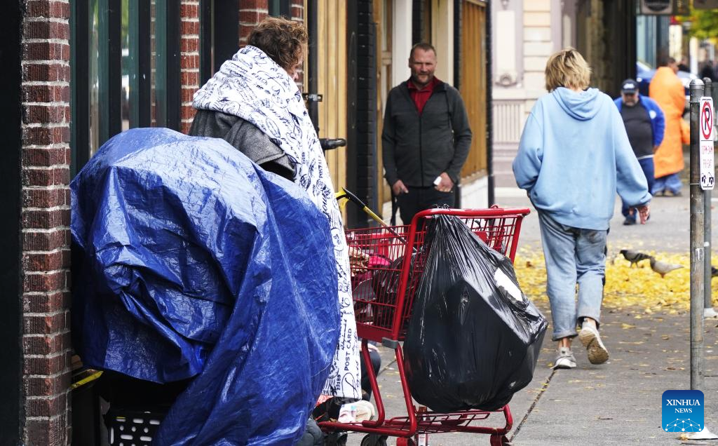 Homeless persons are seen on the sidewalk in Portland, Oregon, the United States, Nov. 4, 2025. The U.S. Senate on Tuesday again failed to pass a temporary funding bill, marking the 14th unsuccessful attempt. This means the federal government shutdown is on track to surpass the 35-day record set during the 2018-2019 shutdown and become the longest in U.S. history. (Xinhua/Wu Xiaoling)