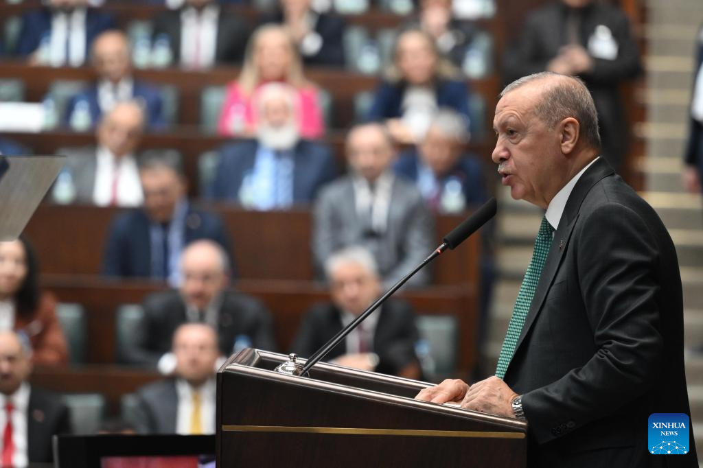 Turkish President Recep Tayyip Erdogan addresses a parliamentary group meeting of the ruling Justice and Development Party (AKP) in Ankara, Türkiye, on Nov. 5, 2025. Erdogan said on Wednesday that the country is making progress toward its long-standing goal of eliminating terrorism within its borders, attributing the success to the efforts of all relevant state institutions. (Mustafa Kaya/Handout via Xinhua)