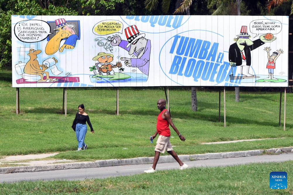 Pedestrians walk past a billboard bearing cartoons that condemn the U.S. economic blockade against Cuba, in Havana, capital of Cuba, Nov. 5, 2025. (Photo by Joaquín Hernández/Xinhua)