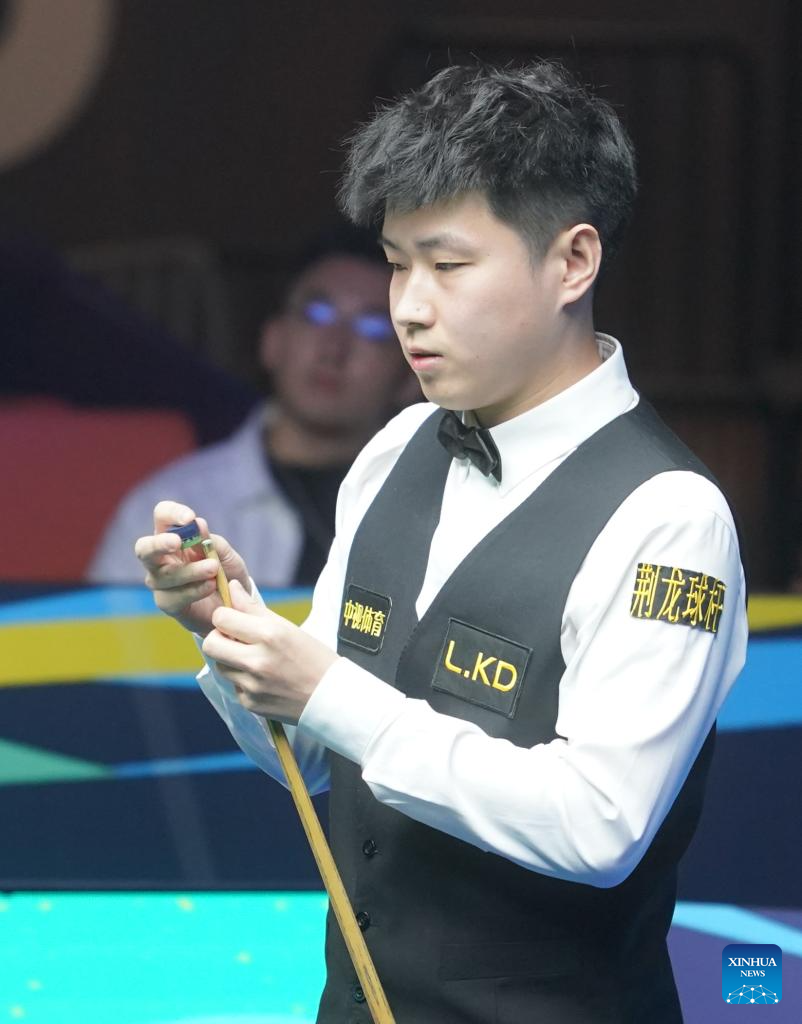Zhao Xintong competes during the round of 16 match between Zhao Xintong of China and Si Jiahui of China at the 2025 World Snooker Tour International Championship in Nanjing, east China's Jiangsu Province, Nov. 5, 2025. (Photo by Liu Zhenrui/Xinhua)