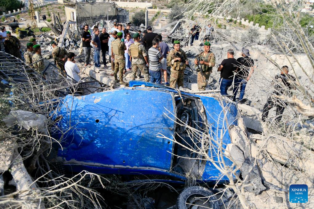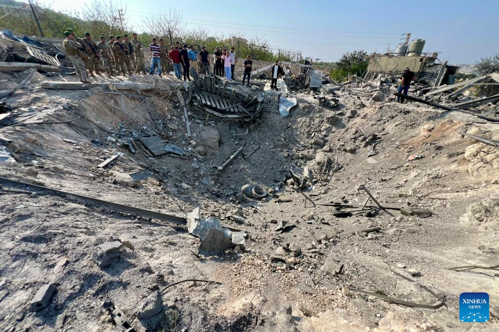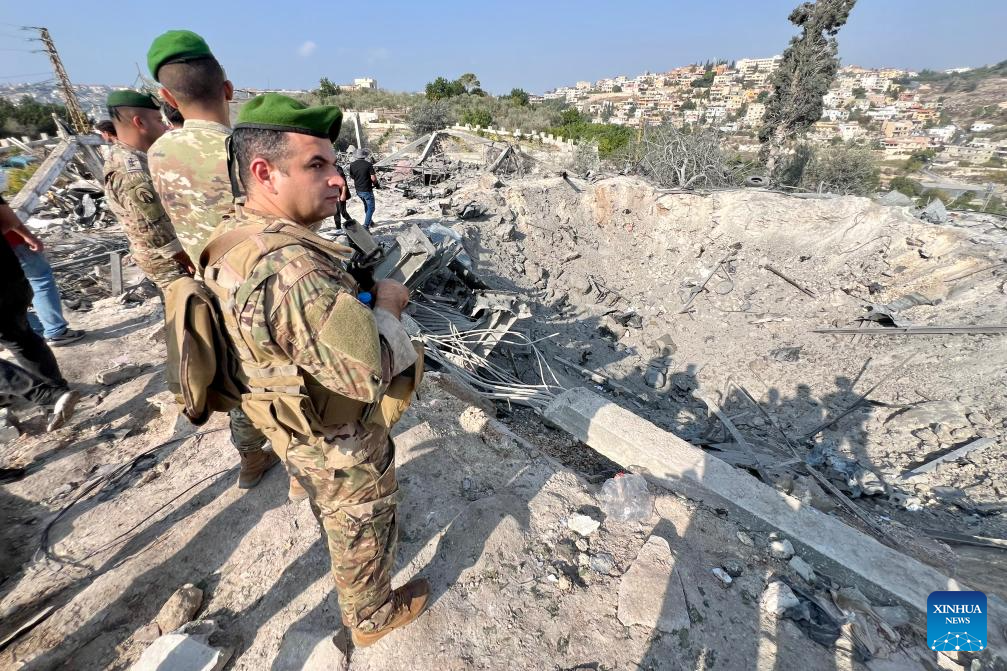 This photo taken on Nov. 6, 2025 shows Lebanese people and soldiers inspecting the site of an Israeli airstrike in the town of Abbassiyeh, Lebanon. One person was killed, and three others injured on Thursday in an Israeli airstrike in southern Lebanon, the National News Agency (NNA) reported.