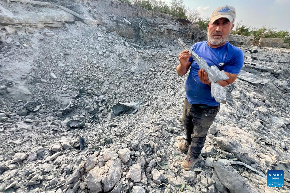 A Lebanese man shows a shell fragment on the site of an Israeli airstrike in the town of Abbassiyeh, Lebanon, Nov. 6, 2025. One person was killed, and three others injured on Thursday in an Israeli airstrike in southern Lebanon, the National News Agency (NNA) reported.
