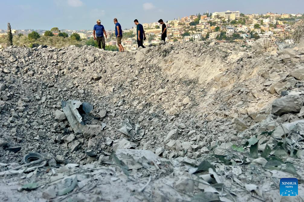 This photo taken on Nov. 6, 2025 shows Lebanese people and soldiers inspecting the site of an Israeli airstrike in the town of Abbassiyeh, Lebanon. (Photo by Ali Hashisho/Xinhua)