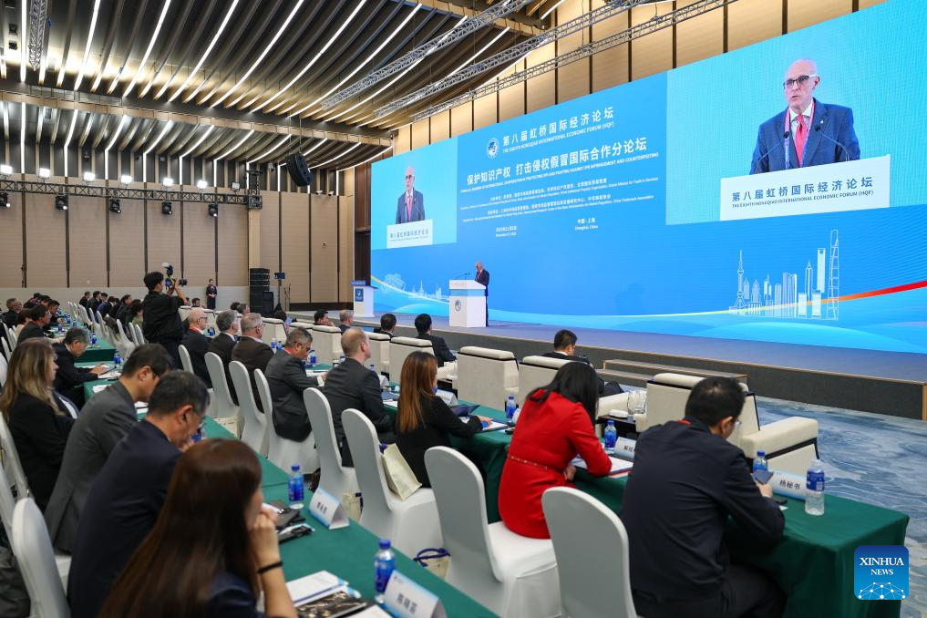 A sub-forum titled "International Cooperation in Protecting IPR and Fighting Against IPR Infringement and Counterfeiting" is held during the 8th Hongqiao International Economic Forum at the National Exhibition and Convention Center (Shanghai) in Shanghai, east China, Nov. 6, 2025. (Xinhua/Wang Zecong)