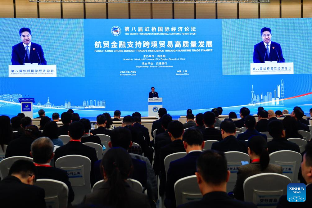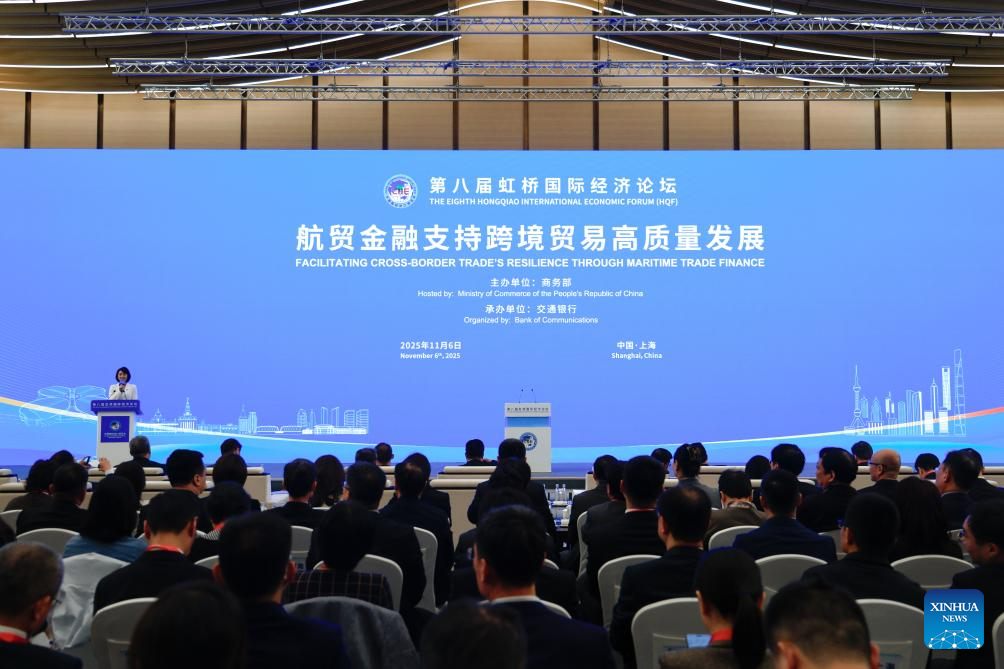 A sub-forum titled "Facilitating Cross-border Trade's Resilience Through Maritime Trade Finance" is held during the 8th Hongqiao International Economic Forum at the National Exhibition and Convention Center (Shanghai) in Shanghai, east China, Nov. 6, 2025. (Xinhua/Liu Jiaqi)
