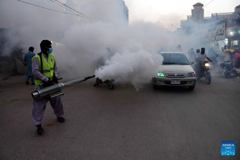 A health worker sprays disinfectants to fight against dengue fever in southern Pakistan's Hyderabad on Nov. 6, 2025. At least 21 people have died from dengue fever in Pakistan's southern Sindh province so far this year, as health authorities battle a sharp rise in infections across the region, officials said on Thursday. (Str/Xinhua)