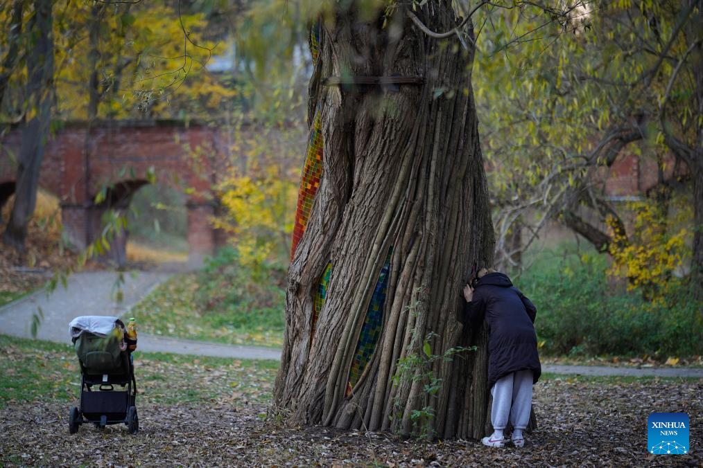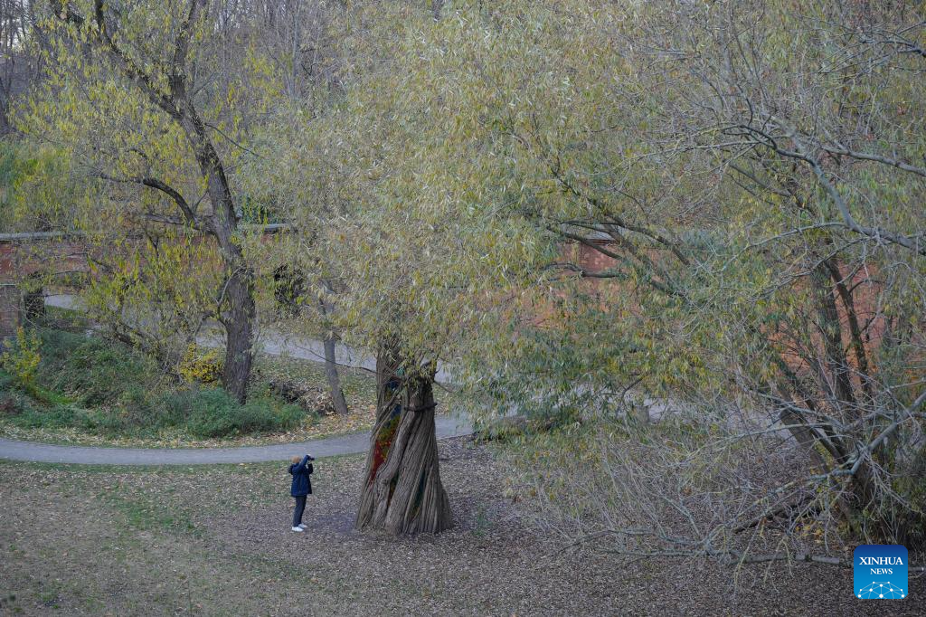 A visitor takes photos of the "Willow Temple" in Warsaw, Poland, on Nov. 5, 2025. The "Willow Temple" is an artistic installation made from a hollow, withered willow tree, transformed with stained glass, metal and wooden elements into a chapel-like space that blends nature and art. (Photo by Jaap Arriens/Xinhua)