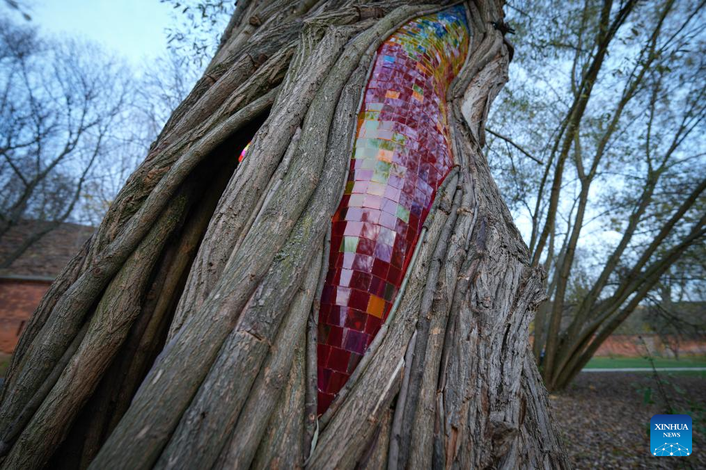 This photo taken on Nov. 5, 2025 shows a close-up of the stained glass on the "Willow Temple" in Warsaw, Poland. The "Willow Temple" is an artistic installation made from a hollow, withered willow tree, transformed with stained glass, metal and wooden elements into a chapel-like space that blends nature and art. (Photo by Jaap Arriens/Xinhua)