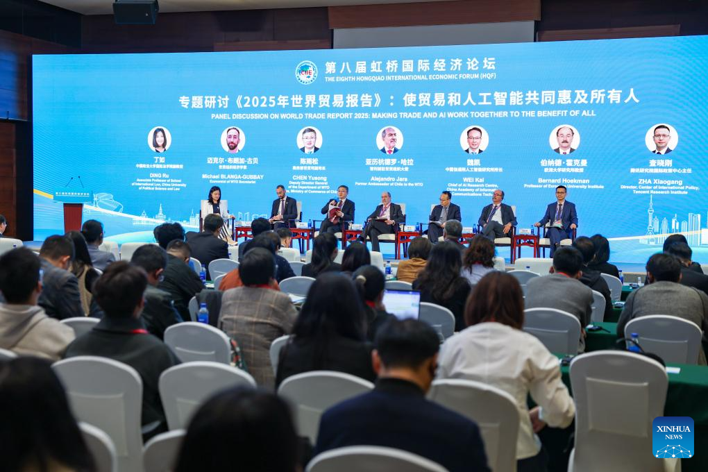 A seminar on World Trade Report 2025 and the launching ceremony of its Chinese edition is held during the 8th Hongqiao International Economic Forum at the National Exhibition and Convention Center (Shanghai) in Shanghai, east China, Nov. 6, 2025. (Xinhua/Wang Zecong)