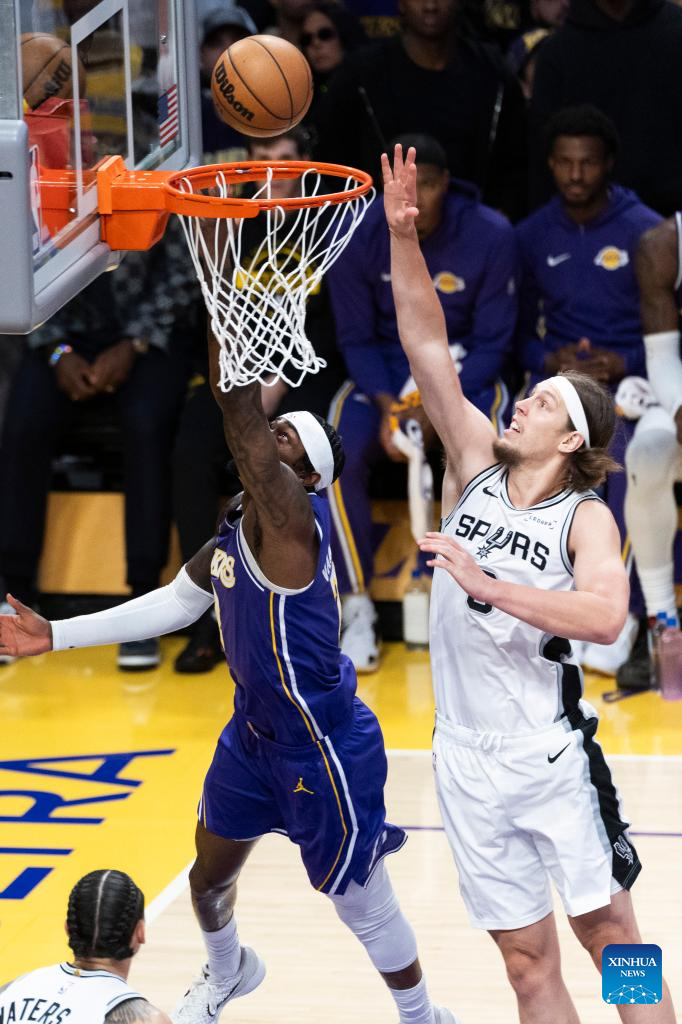 Los Angeles Lakers' Jarred Vanderbilt (L) goes to the basket under pressure from San Antonio Spurs' Kelly Olynyk during the 2025-2026 NBA regular season match between Los Angeles Lakers and San Antonio Spurs in Los Angeles, the United States, on Nov. 5, 2025. (Photo by Ringo Chiu/Xinhua)