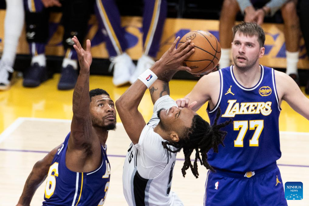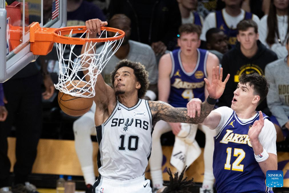 San Antonio Spurs' Jeremy Sochan (L) dunks against Los Angeles Lakers' Jake LaRavia (R) during the 2025-2026 NBA regular season match between Los Angeles Lakers and San Antonio Spurs in Los Angeles, the United States, on Nov. 5, 2025. (Photo by Ringo Chiu/Xinhua)