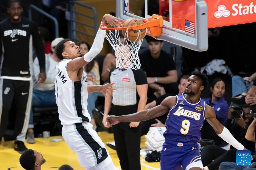 San Antonio Spurs' Victor Wembanyama (L) dunks against Los Angeles Lakers' Bronny James during the 2025-2026 NBA regular season match between Los Angeles Lakers and San Antonio Spurs in Los Angeles, the United States, on Nov. 5, 2025. (Photo by Ringo Chiu/Xinhua)