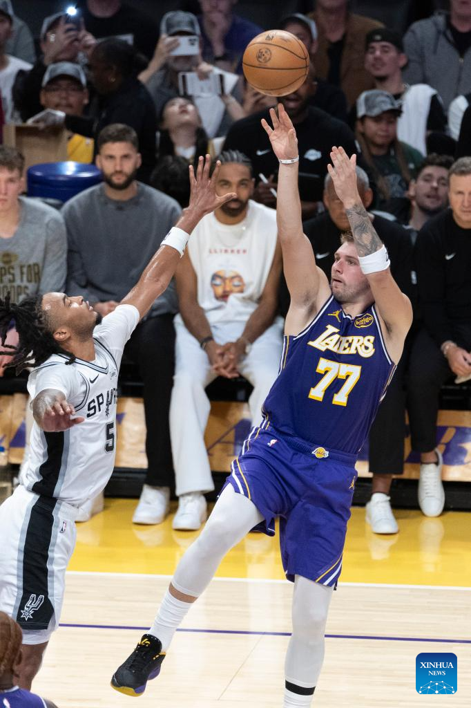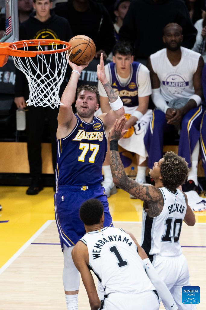 Los Angeles Lakers' Luka Doncic (L) shoots during the 2025-2026 NBA regular season match between Los Angeles Lakers and San Antonio Spurs in Los Angeles, the United States, on Nov. 5, 2025. (Photo by Ringo Chiu/Xinhua)
