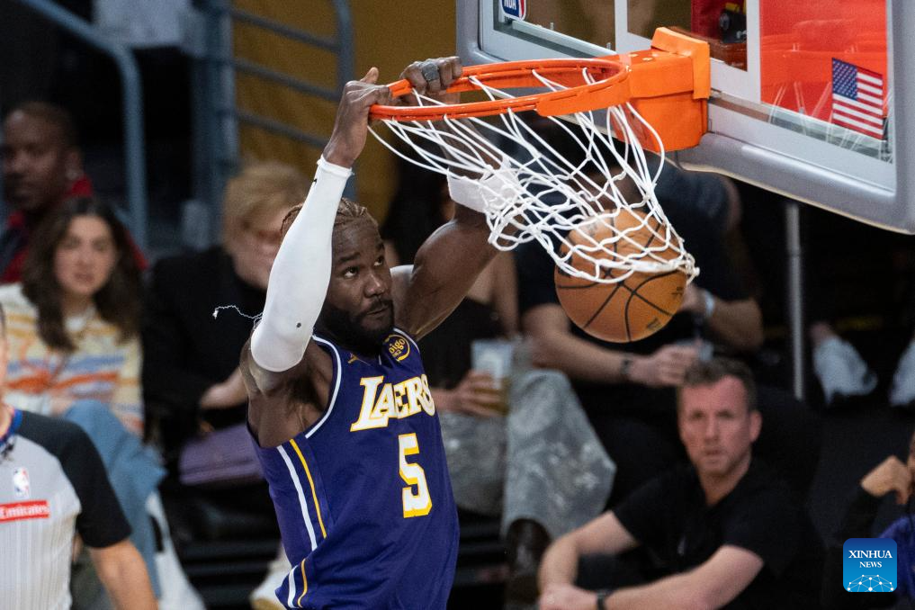 Los Angeles Lakers' Deandre Ayton dunks during the 2025-2026 NBA regular season match between Los Angeles Lakers and San Antonio Spurs in Los Angeles, the United States, on Nov. 5, 2025. (Photo by Ringo Chiu/Xinhua)