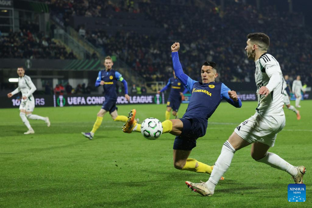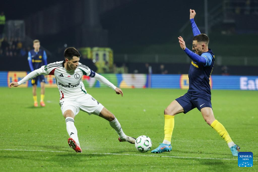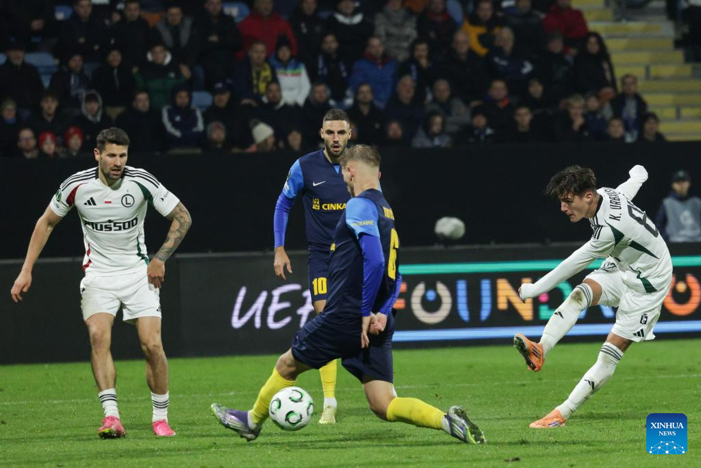 Kacper Urbanski (1st R) of Legia Warszawa shoots during the UEFA Conference League match between NK Celje and Legia Warszawa in Celje, Slovenia, on Nov. 6, 2025. (Photo by Zeljko Stevanic/Xinhua)