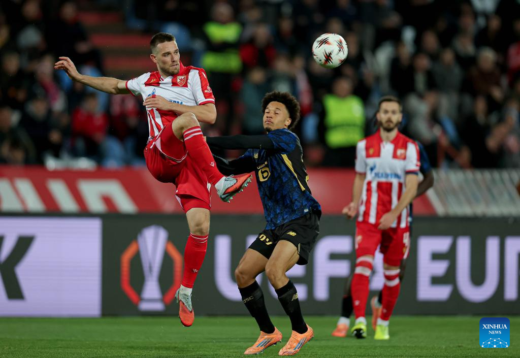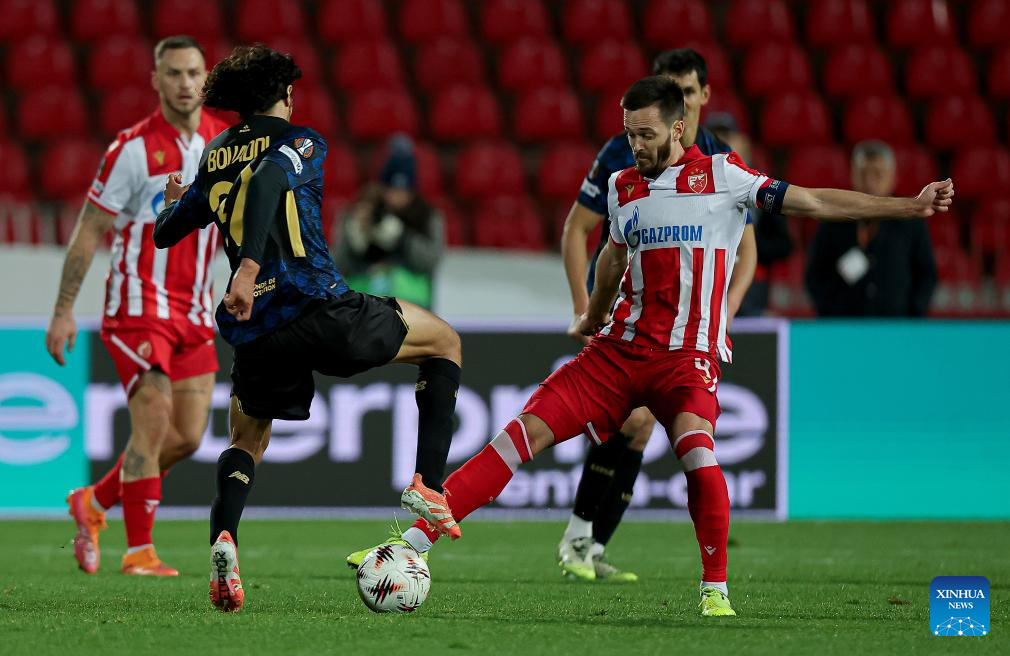 Crvena Zvezda's Nemanja Radonjic (R) vies with LOSC Lille's Calvin Verdonk during the UEFA Europa League football match between Crvena Zvezda and LOSC Lille in Belgrade, Serbia, on Nov. 6, 2025. (Photo by Predrag Milosavljevic/Xinhua)