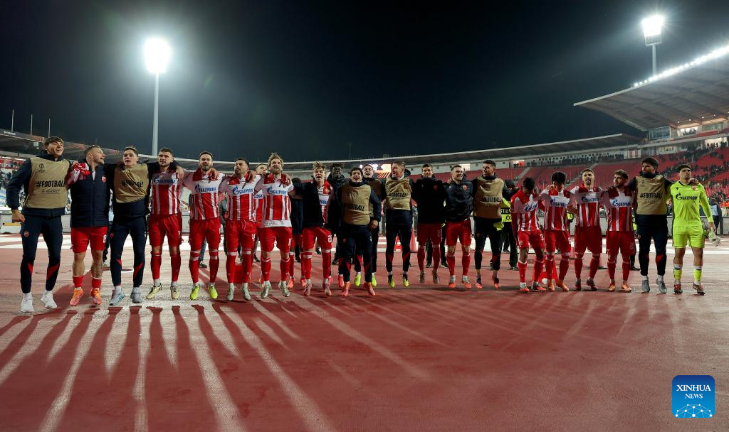 Players of Crvena Zvezda celebrate victory after winning the UEFA Europa League football match between Crvena Zvezda and LOSC Lille in Belgrade, Serbia, on Nov. 6, 2025. (Photo by Predrag Milosavljevic/Xinhua)