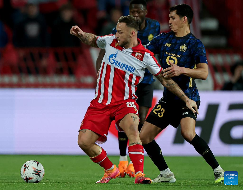 Crvena Zvezda's Mirko Ivanic (front R) vies with LOSC Lille's Ayyoub Bouaddi (front L) during the UEFA Europa League football match between Crvena Zvezda and LOSC Lille in Belgrade, Serbia, on Nov. 6, 2025. (Photo by Predrag Milosavljevic/Xinhua)