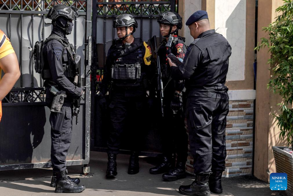 Police officers stand guard in front of a school after an explosion hit the school mosque in Jakarta, Indonesia, Nov. 7, 2025. An explosion at a mosque inside a school in Jakarta, the capital of Indonesia, during Friday prayers injured 54 people, the city's police chief Asep Edi Suheri said. (Photo by B.Nugraha/Xinhua)