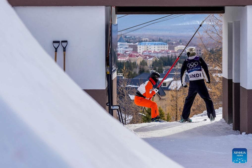 Wang Xindi (R) of team China attends a training session of freestyle skiing aerials for the Milano-Cortina 2026 Olympic Winter Games in Arxan, north China's Inner Mongolia Autonomous Region, Nov. 7, 2025. (Xinhua/Hu Chao)
