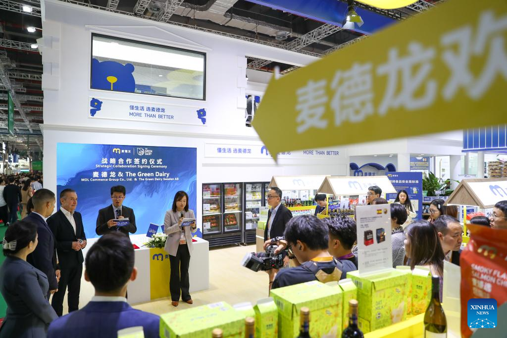 The Strategic Collaboration Signing Ceremony between MDL Commerce Group Co., Ltd., an eight-year attendee of the China International Import Expo (CIIE), and The Green Dairy Sweden AB is pictured during the eighth CIIE in east China's Shanghai, Nov. 7, 2025. The eighth CIIE, which opened in Shanghai on Wednesday and will last till Nov. 10, has attracted 4,108 overseas exhibitors from 155 countries, regions and international organizations.