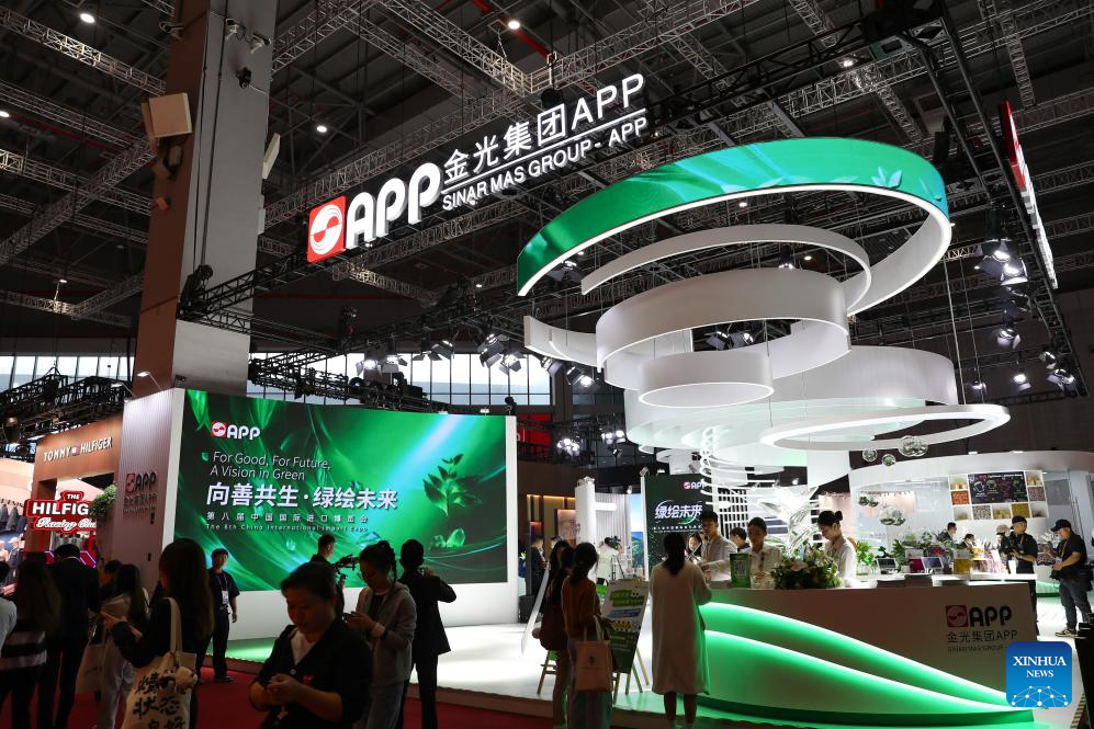 This photo taken on Nov. 7, 2025 shows the booth of Sinar Mas Group - Asia Pulp & Paper Co., Ltd., an eight-year attendee of the China International Import Expo (CIIE), during the eighth CIIE in east China's Shanghai. The eighth CIIE, which opened in Shanghai on Wednesday and will last till Nov. 10, has attracted 4,108 overseas exhibitors from 155 countries, regions and international organizations.