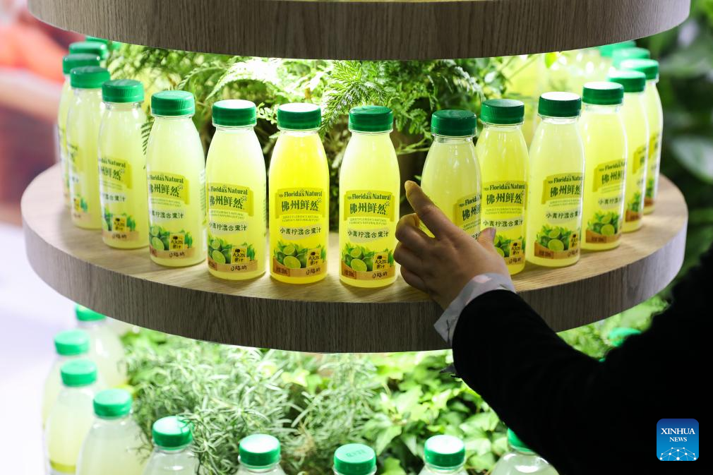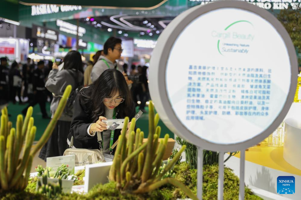 A visitor takes photos of the products of Cargill, an eight-year attendee of the China International Import Expo (CIIE), during the eighth CIIE in east China's Shanghai, Nov. 7, 2025. The eighth CIIE, which opened in Shanghai on Wednesday and will last till Nov. 10, has attracted 4,108 overseas exhibitors from 155 countries, regions and international organizations.