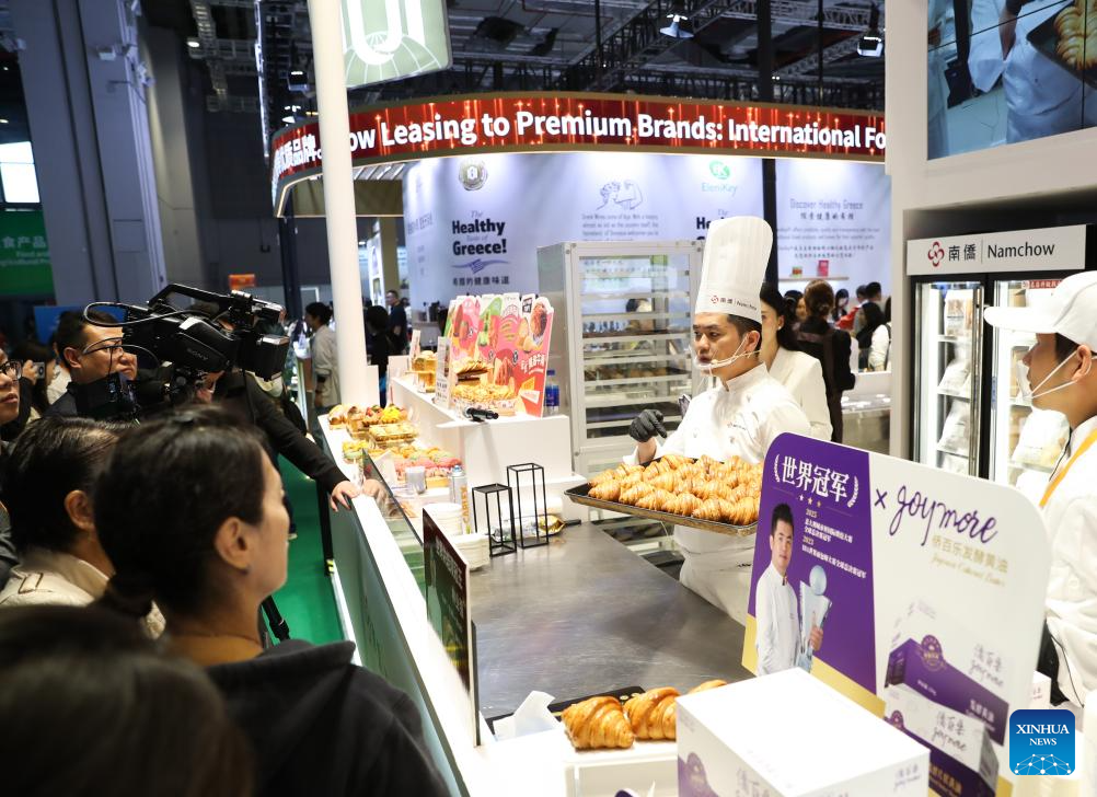 Bakers introduce the products of Namchow Group, an eight-year attendee of the China International Import Expo (CIIE), during the eighth CIIE in east China's Shanghai, Nov. 7, 2025. The eighth CIIE, which opened in Shanghai on Wednesday and will last till Nov. 10, has attracted 4,108 overseas exhibitors from 155 countries, regions and international organizations.