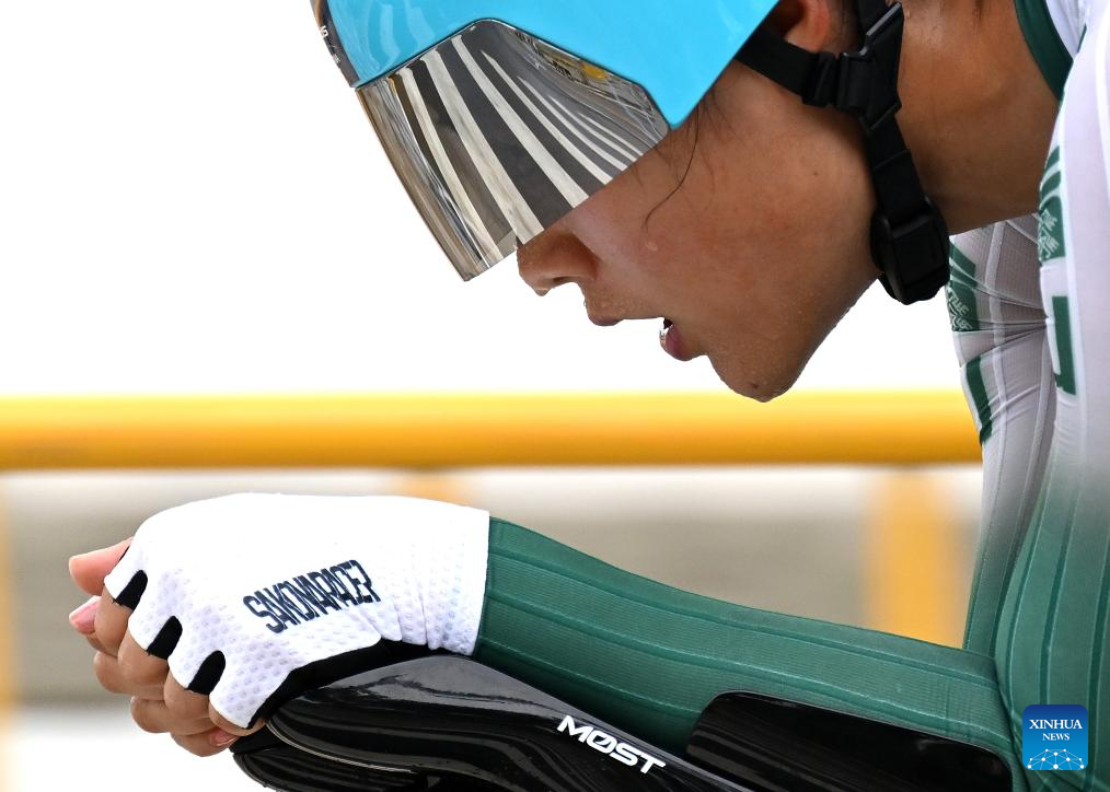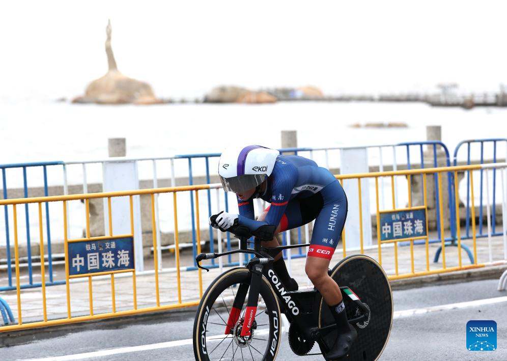 Zhao Wenhui of Hunan competes during the women's individual time trial of cycling road at China's 15th National Games in Zhuhai, south China's Guangdong Province, Nov. 7, 2025. (Xinhua/Mao siqian)