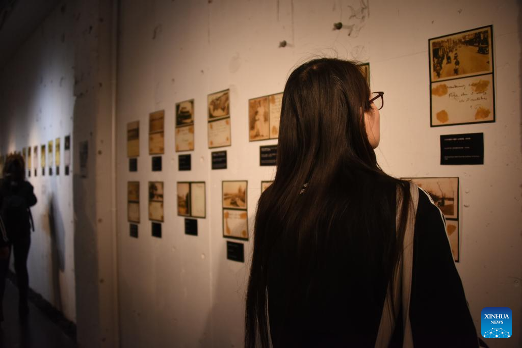 A visitor looks at the photos during the photo exhibition in Tokyo, Japan, on Oct. 29, 2025. Young Frenchman Marcus Detrez recently held a photo exhibition in Tokyo, showcasing dozens of photocopies and some originals of historical photographs documenting the atrocities committed by the Japanese imperial army during its invasion of China, such as bombing Shanghai and massacring civilians. (Xinhua/Hu Xiaoge)