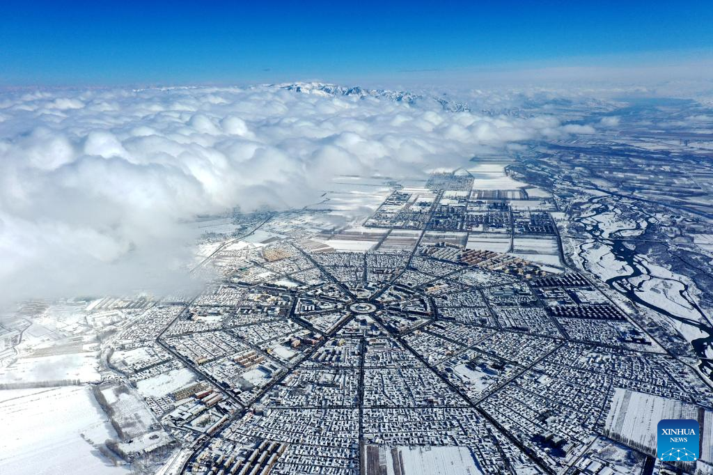 An aerial drone photo taken on Nov. 6, 2025 shows the snow scenery in Tekes County, northwest China's Xinjiang Uygur Autonomous Region. (Photo by Liu Lingbo/Xinhua)