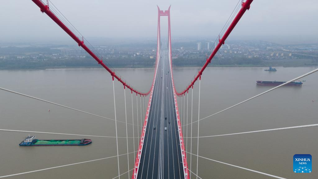 An aerial drone photo taken on Nov. 6, 2025 shows vehicles running on a bridge over the Yangtze River in Tongling City, east China's Anhui Province. The bridge was put into operation on Thursday, with a length of 11.9 kilometers and serving the roles as highway, inter-city railway and cargo railway. (Xinhua/Zhang Duan)