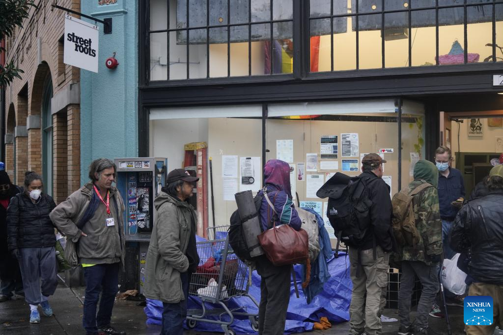 Homeless persons wait to receive relief supplies from a nonprofit organization in Portland, Oregon, the United States, Nov. 5, 2025. On Wednesday, the U.S. federal government shutdown entered its 36th day, surpassing the previous 35-day record set during the 2018-2019 shutdown, making it the longest government shutdown in U.S. history. (Xinhua/Wu Xiaoling)