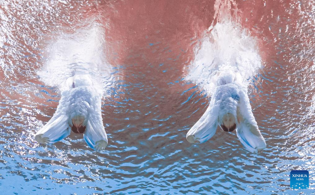 Chen Yuxi/Zhang Minjie of Shanghai compete during the women's synchronised 10m platform final of diving at China's 15th National Games in Guangzhou, south China's Guangdong Province, Nov. 6, 2025. (Xinhua/Xia Yifang)