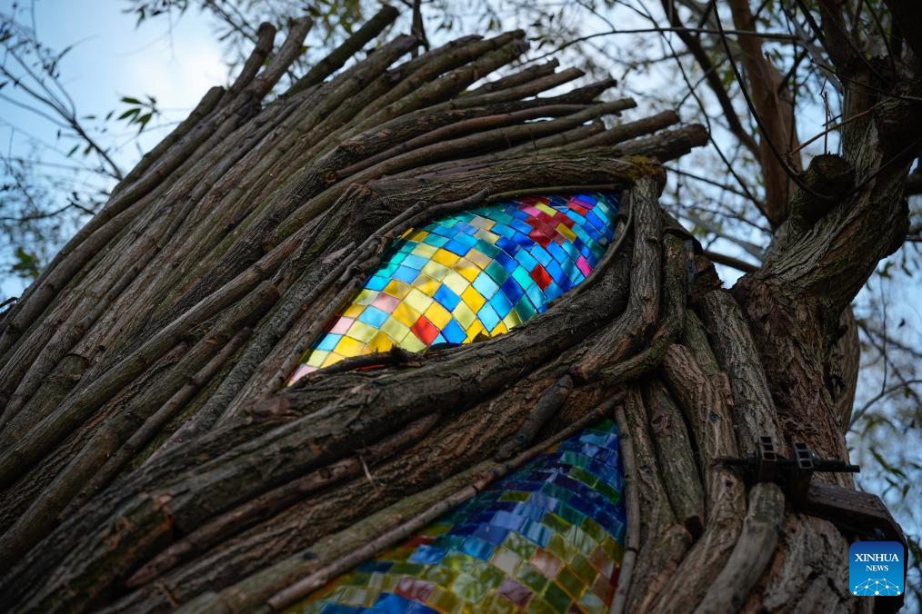 This photo taken on Nov. 5, 2025 shows a close-up of the stained glass on the "Willow Temple" in Warsaw, Poland. The "Willow Temple" is an artistic installation made from a hollow, withered willow tree, transformed with stained glass, metal and wooden elements into a chapel-like space that blends nature and art. (Photo by Jaap Arriens/Xinhua)