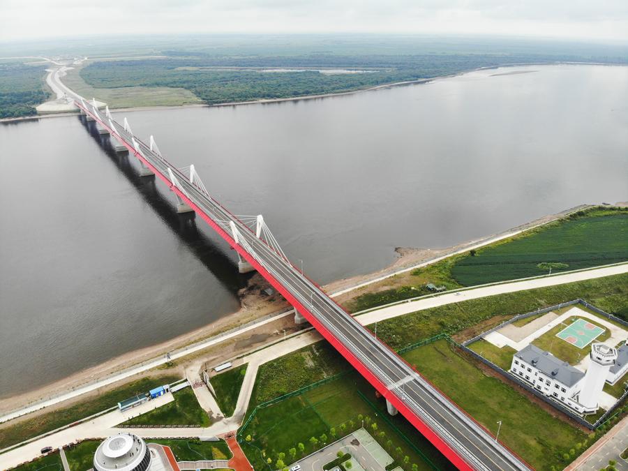 This aerial photo taken on Aug. 11, 2023 shows the Heihe-Blagoveshchensk cross-border highway bridge as seen from the city of Heihe, northeast China's Heilongjiang Province. (Xinhua/Wang Song)