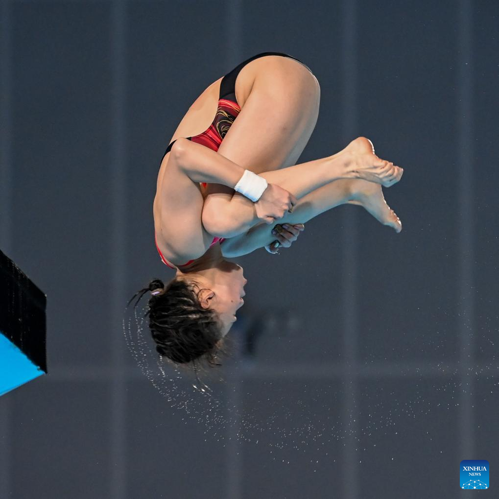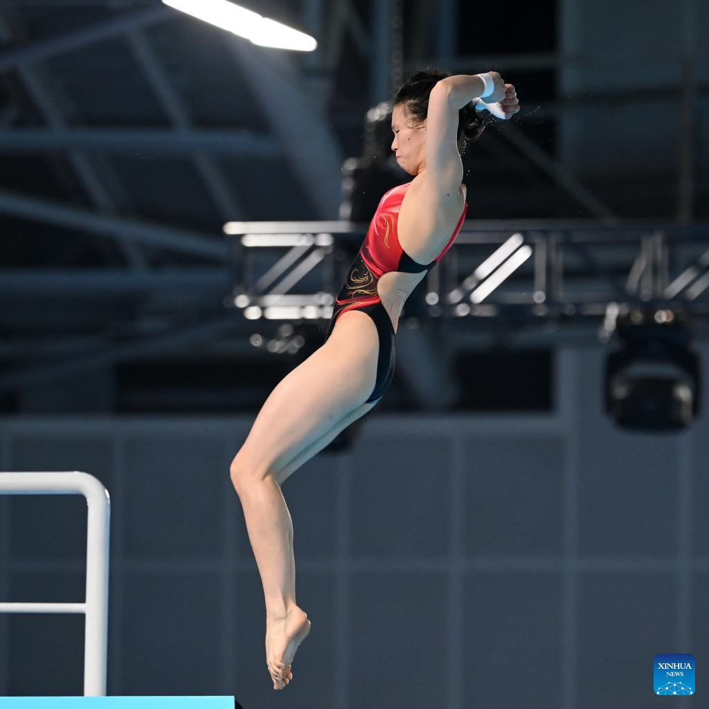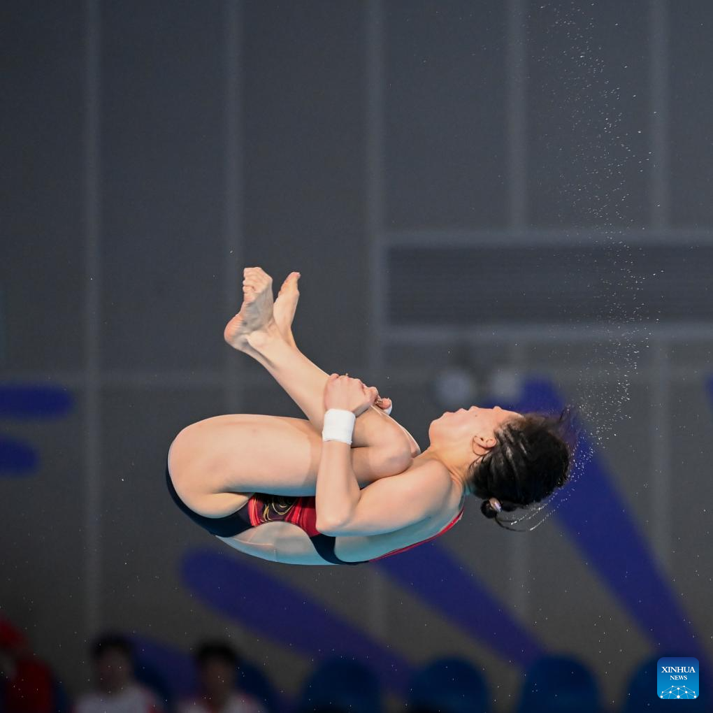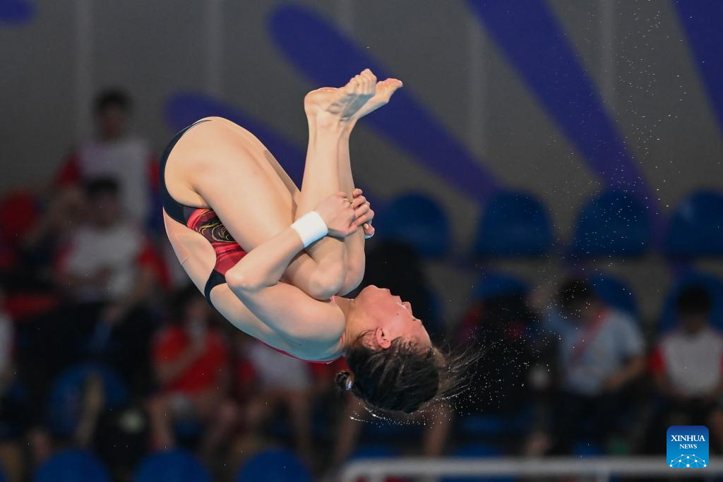 Chen Yuxi of Shanghai competes during the women's 10m platform semifinal of diving at China's 15th National Games in Guangzhou, south China's Guangdong Province, Nov. 8, 2025. (Xinhua/Tang Yi)