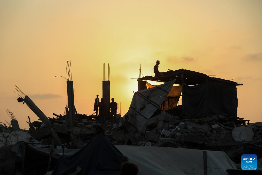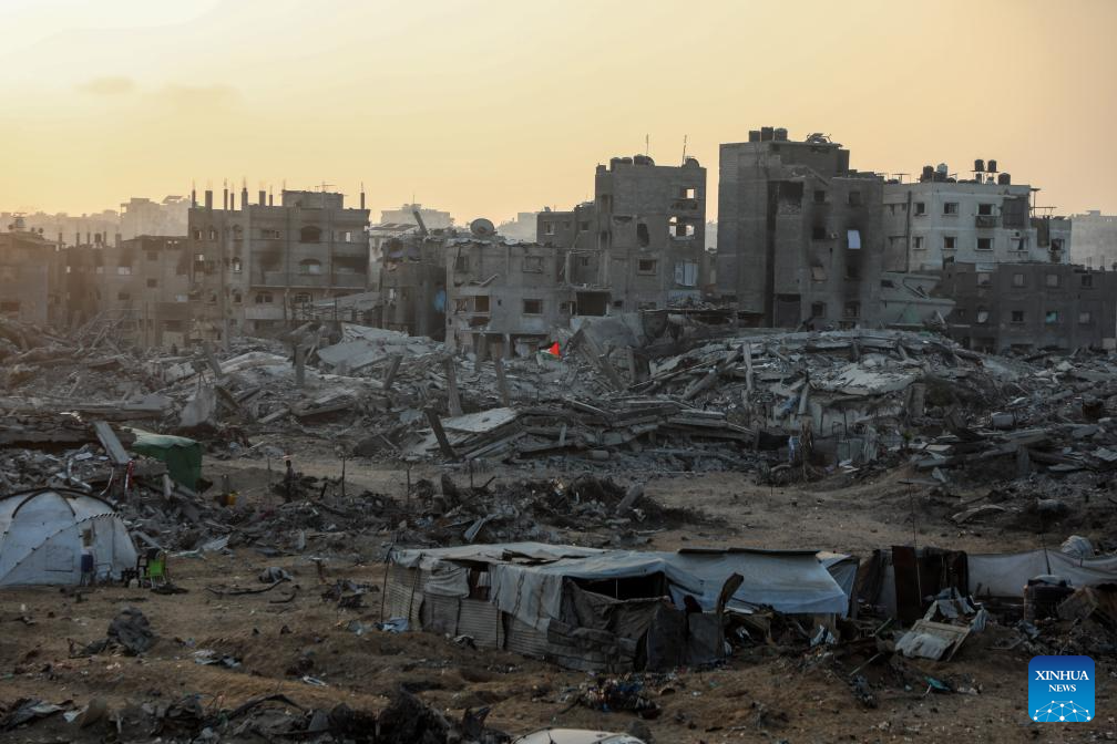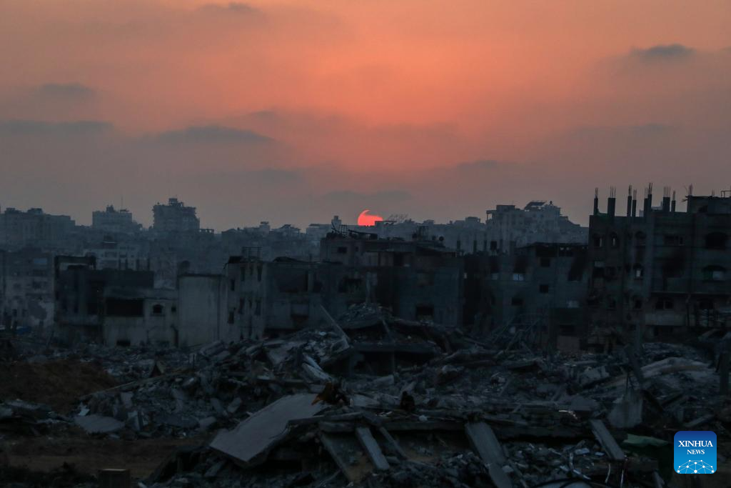 Photo taken on Nov. 6, 2025 shows a sunset in the destroyed Sheikh Radwan area, north of Gaza City. (Photo by Rizek Abdeljawad/Xinhua)
