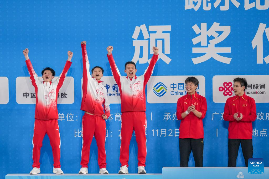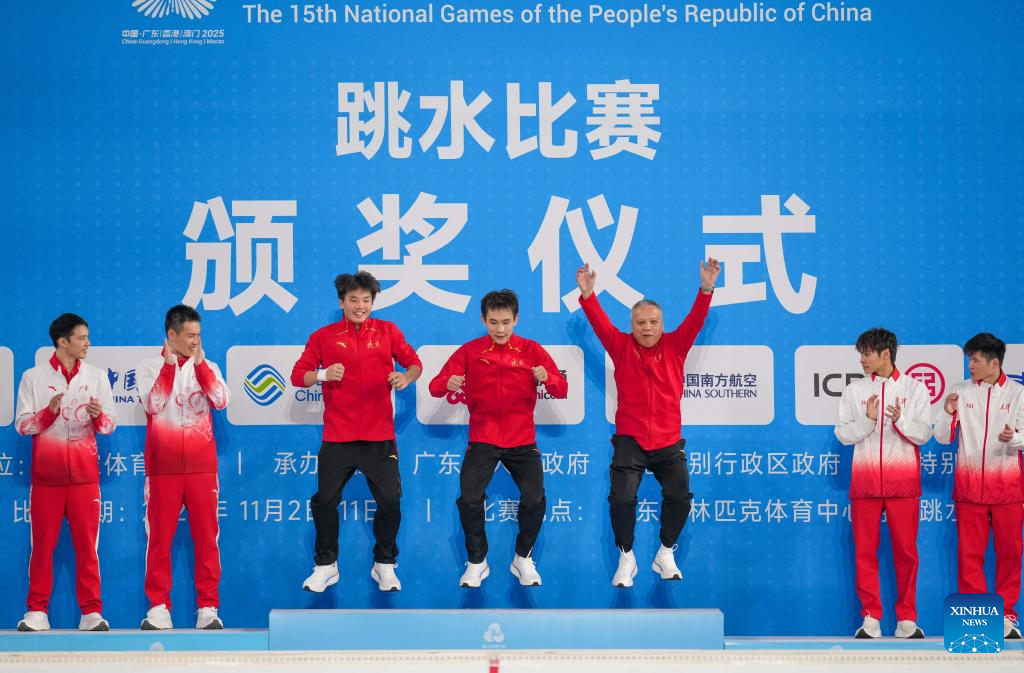 Gold medalists Bai Yuming/Yang Hao of Shaanxi react with their coach during the awarding ceremony for the men's synchronised 10m platform of diving at China's 15th National Games in Guangzhou, south China's Guangdong Province, Nov. 7, 2025. (Xinhua/Xue Yuge)