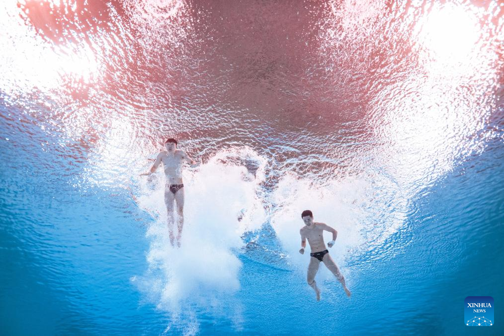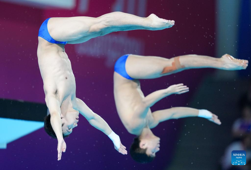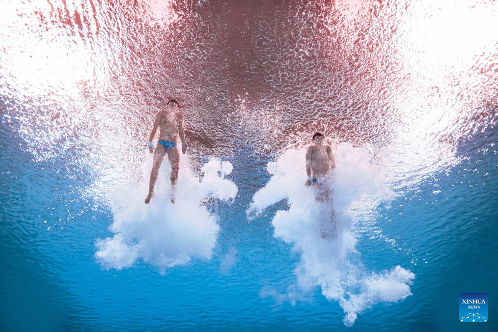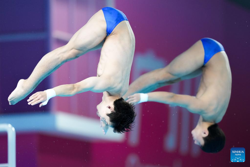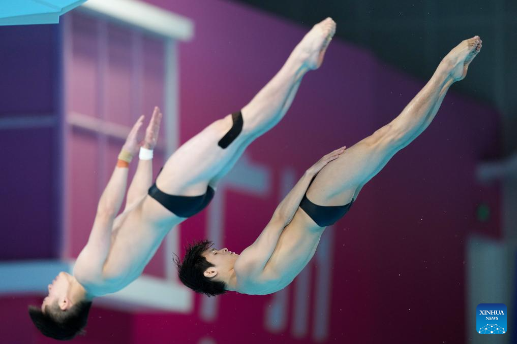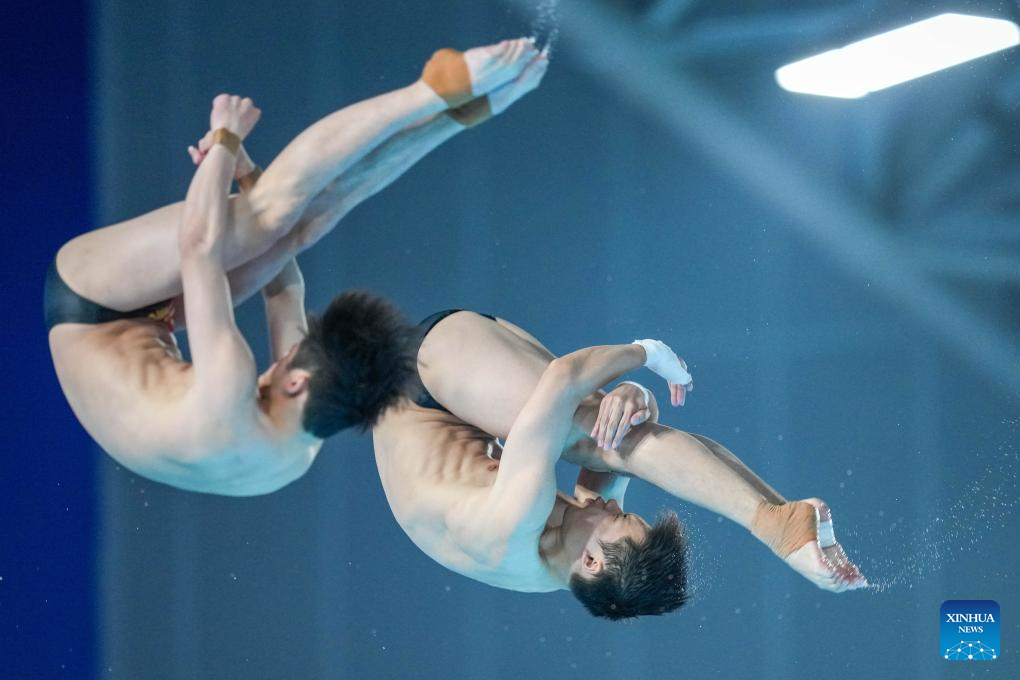 Bai Yuming/Yang Hao of Shaanxi compete during the men's synchronized 10m platform final of diving at China's 15th National Games in Guangzhou, south China's Guangdong Province, Nov. 7, 2025. (Xinhua/Xue Yuge)