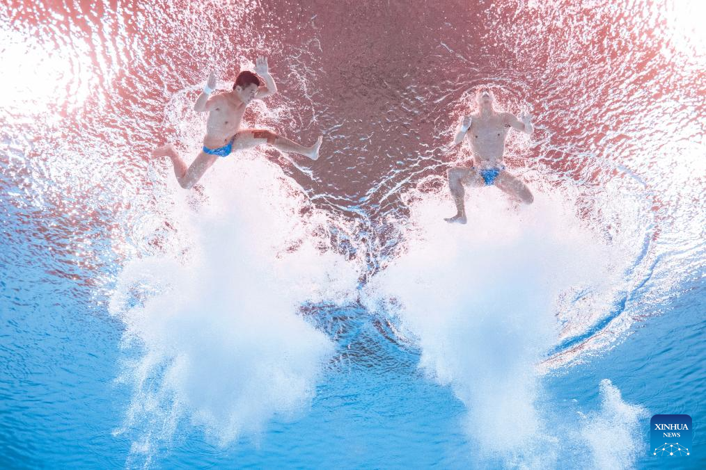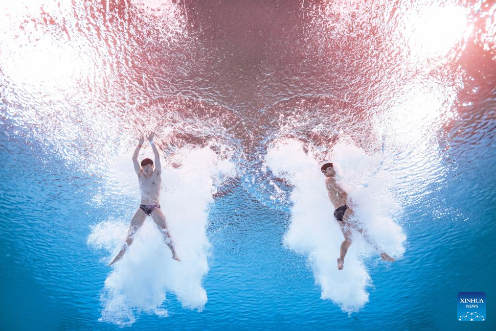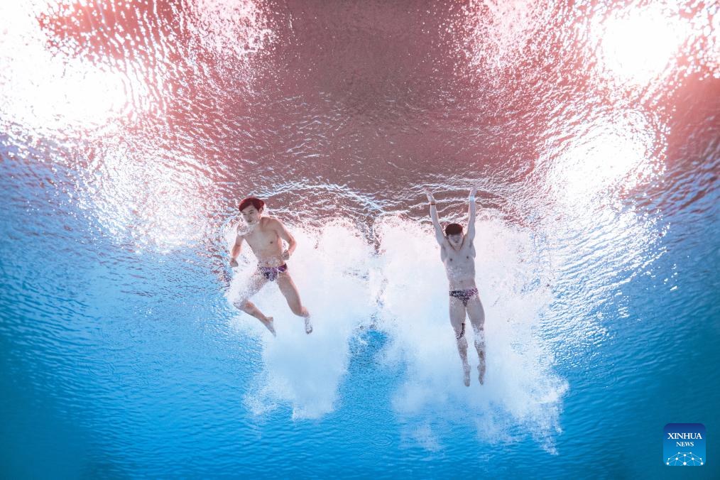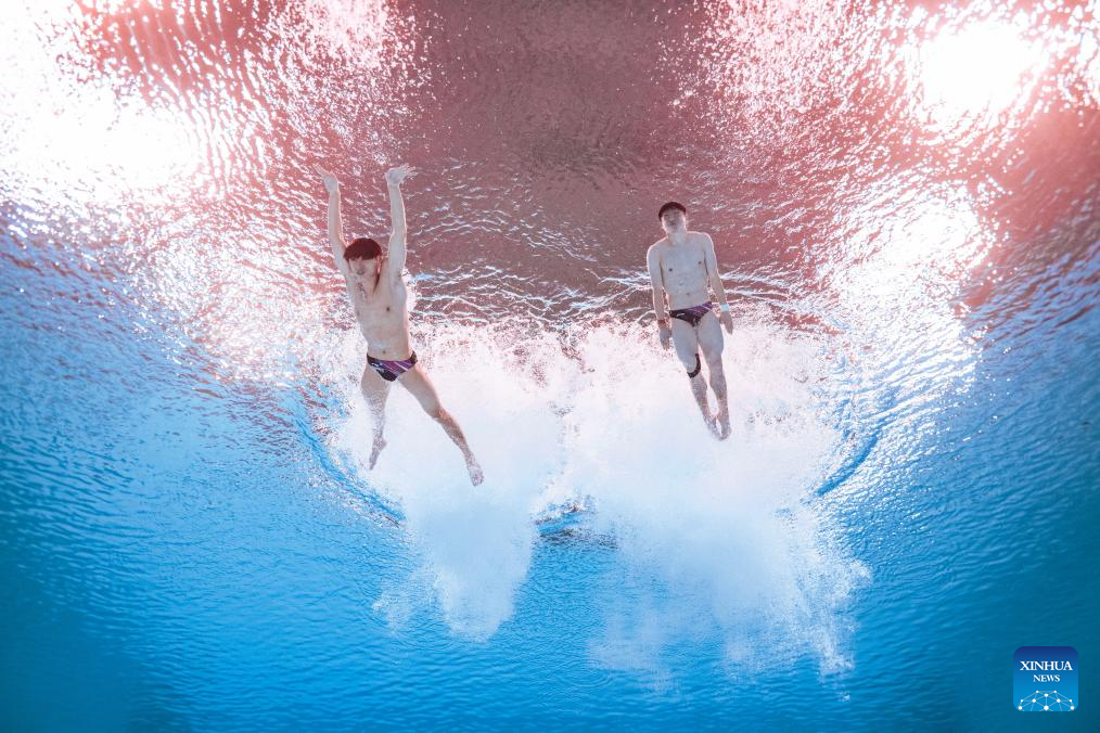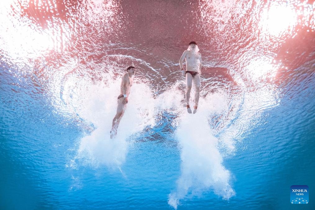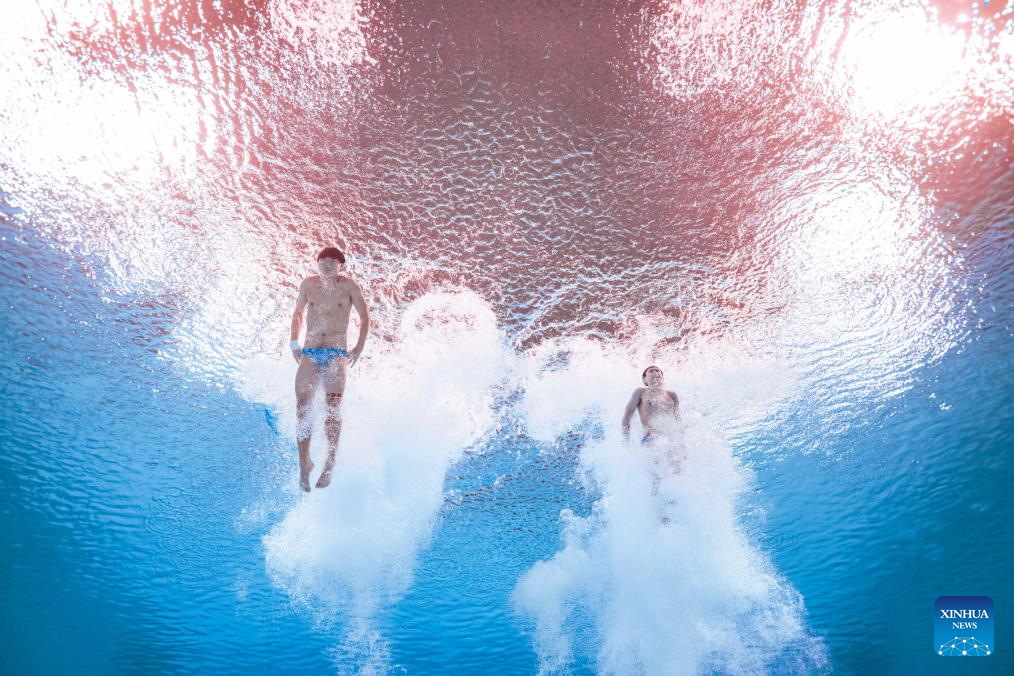 Bai Yuming/Yang Hao of Shaanxi compete during the men's synchronized 10m platform final of diving at China's 15th National Games in Guangzhou, south China's Guangdong Province, Nov. 7, 2025. (Xinhua/Xue Yuge)