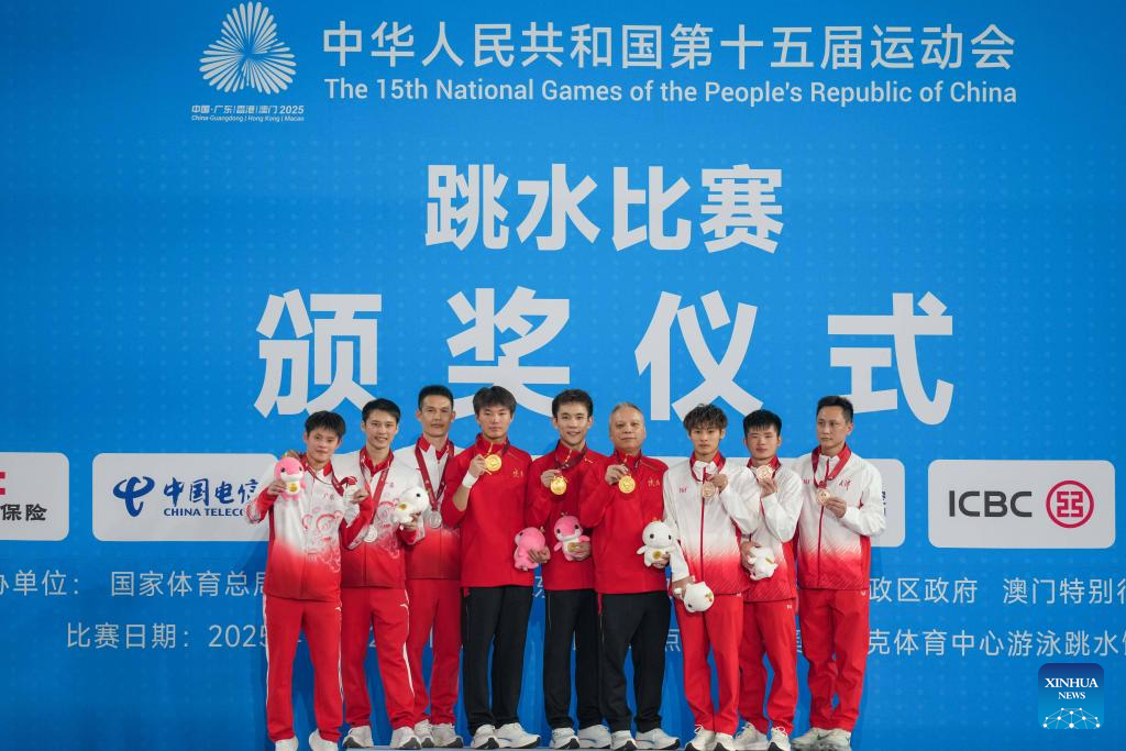 Gold medalists Bai Yuming/Yang Hao (C) of Shaanxi, silver medalists Chen Aisen/Zhu Zifeng (L) of Guangdong and bronze medalists Huang Zigan/Yang Ling of Tianjin pose for photos with their coaches during the awarding ceremony for the men's synchronised 10m platform of diving at China's 15th National Games in Guangzhou, south China's Guangdong Province, Nov. 7, 2025. (Xinhua/Xue Yuge)